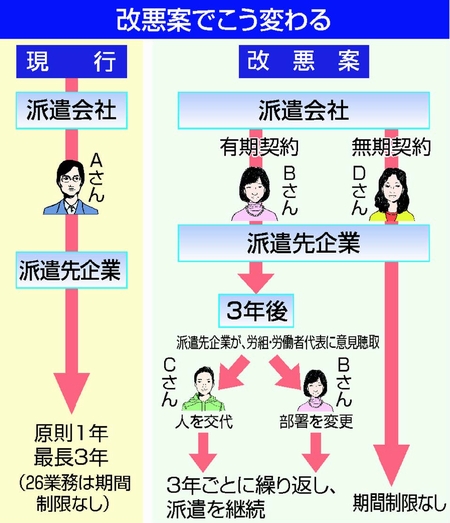労働者派遣法の改悪に反対しましょう安倍自民・公明政権は、国民の批判をあびて通常国会で廃案に なった労働者派遣法の改悪案を、今国会に再提出し、成立をね らっています。これまで「臨時的・一時的」な業務に限って認めてきた派遣の 原則を大転換し、無制限に広げようとする重大な内容で、「景気 の調整弁」として派遣を、企業が自由にを使えるようにするとい うのが最大のねらいです。 本来、雇用は、企業主が自分の会社で働かせる労働者を「直接 雇用」するのが原則です。派遣労働はこの原則に反して、仲介業者 が間に入って賃金をピンハネし、貸し出される「間接雇用」です。 いまの派遣法は、派遣はあくまで「臨時的・一時的」な利用に 限って可能としていて、一般業務派遣は期間を制限(原則1年、 最大3年)する規制が設けられています。これを超えて働かせる 場合、派遣先企業は労働者に直接雇用を申し込む義務があります (第40条4項)。 改悪案では、派遣労働者が派遣会社に無期雇用で雇われている 場合は、派遣期間の制限がなくなります。派遣会社の正規雇用に すれば安定雇用になり、不安定な身分が改善されるという理屈です。 これは、事実に反するでたらめな主張です。 2008年のリーマン・ショックで「大量派遣切り」が強行され たときの例を見ればあきらかです。景気が悪くなったからと派遣先 から大量に派遣契約を打ち切られたとき、「うちの派遣労働者は 無期雇用だから」と雇用を守った派遣会社がどれだけあっでしょうか。 また改悪案では、派遣労働者のキャリアアップにむけて、「教育 訓練を実施しなければならない」としています。しかし、派遣元 企業が実施するうえ、その内容も明らかではありません。労働者が 希望するキャリアアップにつながるのか、まったくわかりません。